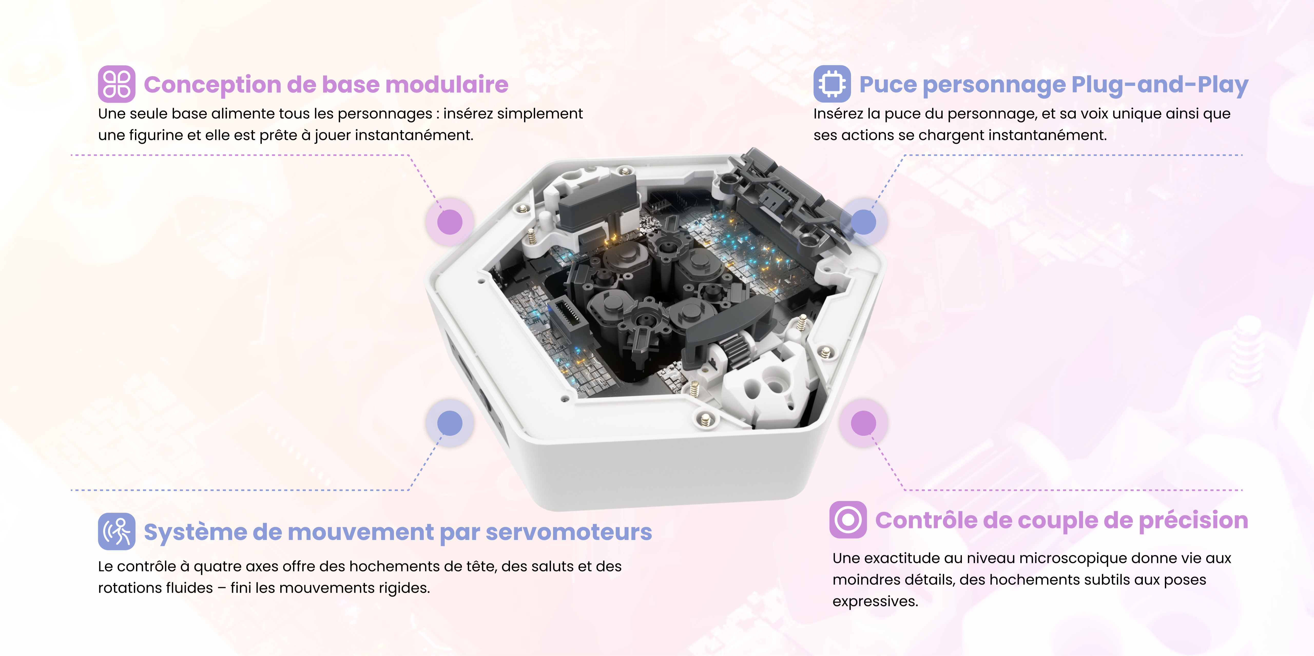 Derrière le divertissement se cache un système ingénieux : une base qui alimente chaquepersonnage, des puces à insérer qui débloquent instantanément les voix et les actions, etdes servomoteurs de précision qui rendent chaque mouvement fluide et naturel.