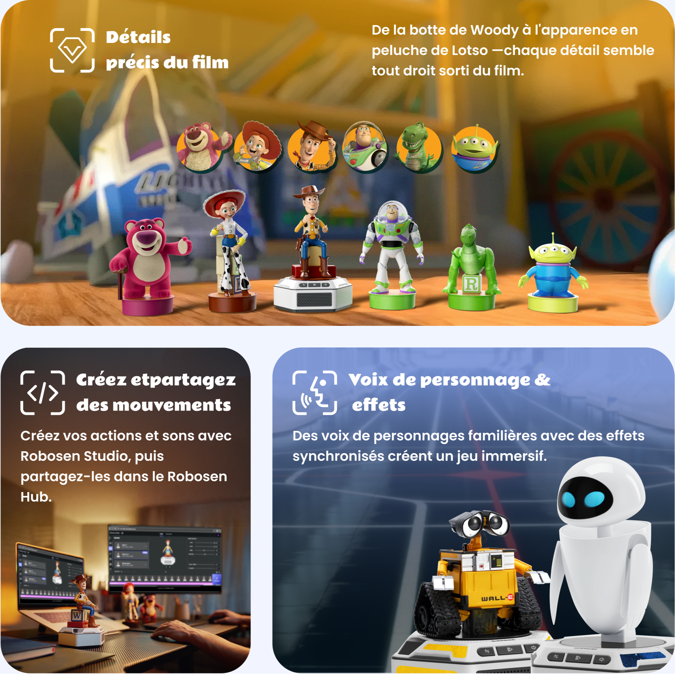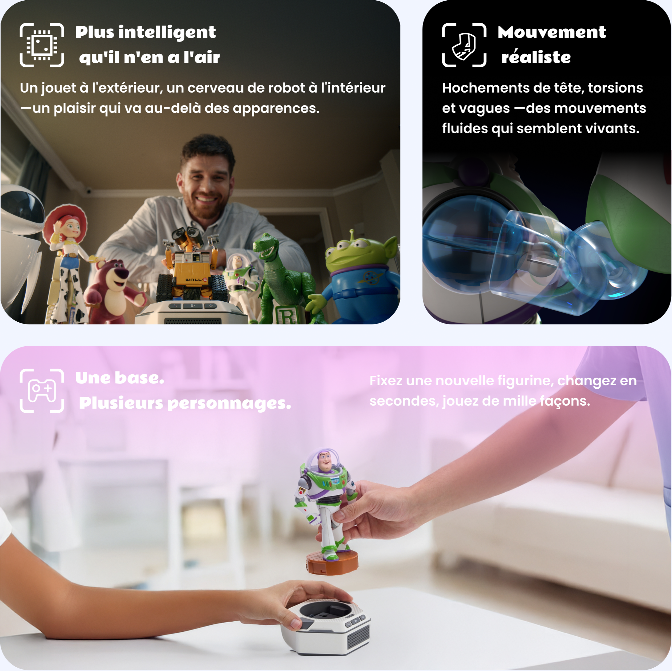 Une base intelligente fonctionne avec chaque Mini Robot. Fixez Woody, passez à Buzz, ou donnez vie à WALL·E — changer de personnage est rapide, facile et offre toujours quelque chose de nouveau à jouer.