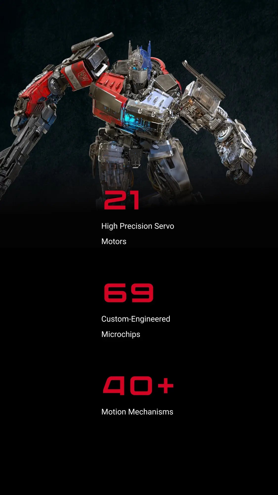 Les robots de la série Signature de Robosen sont conçus pour rapprocher l'expérience cinématographique de la réalité. Le rendu cinématographique hyperréaliste peut maintenant être visualisé sur chaque pièce individuelle de ROTB Optimus Prime, qui ont toutes été minutieusement peintes à la main pour donner vie à la magie du film. Un équilibre a été trouvé pour infuser l'ingénierie robotique de Robosen afin de rendre l'expérience dynamique et interactive, tout en préservant l'authenticité du film.